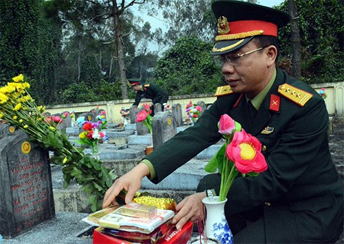 Thượng tá Vũ Quang Tuynh thắp hương cho bố đẻ là liệt sĩ Vũ Xuân Vang, hy sinh năm 1971, đang yên nghỉ tại nghĩa trang.