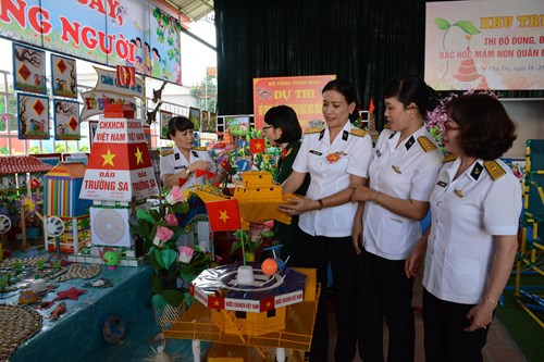 Trò chuyện với chúng tôi, Thiếu tá Nguyễn Thị Minh, Trợ lý Ban Phụ nữ Quân chủng Hải quân chia sẻ: Lần đầu tiên tham gia hội thi toàn quân, đoàn chúng tôi gồm 3 cô giáo mầm non đến từ Căn cứ 696 và Nhà trẻ Vùng 5 Hải quân. Quả thực so với các đội bạn, các cô giáo mầm non của đoàn Hải quân ít về số lượng; kinh nghiệm tham gia thi chưa nhiều, lại đến từ những địa bàn xa xôi, vì thế có những khó khăn nhất định. Nhưng với tinh thần được giao lưu học hỏi, chia sẻ kinh nghiệm nên tâm thế các thành viên trong đoàn khá thoải mái và tự tin. Giới thiệu với chúng tôi gian trưng bày, Đại úy QNCN Bùi Ngọc Hiếu, giáo viên mầm non Căn cứ 696 chia sẻ: Khi có kế hoạch tham gia hội thi, chúng tôi lên ý tưởng khu trưng bày đồ dùng, đồ chơi bậc học mầm non với tiêu chí ấn tượng, dễ hiểu, dễ nhớ gắn với đặc thù nhiệm vụ của cán bộ, chiến sĩ Quân chủng Hải quân. Gian trưng bày được chia làm hai phần nhằm tái tạo hình ảnh biển đảo, bờ biển và thềm lục địa. Chỉ từ những vỏ sò, vỏ ốc, mảnh bìa các-tông..., nhờ bàn tay khéo léo của các cô giáo mầm non, hình ảnh bờ biển, thềm lục địa, nhà giàn, quần đảo Trường Sa được tái hiện thật sinh động…