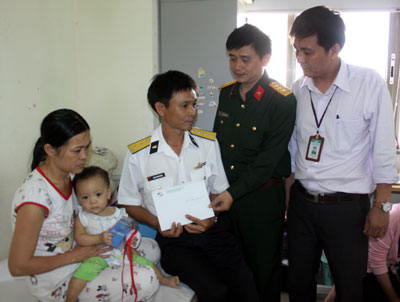 Khi chúng tôi đến thăm cháu bé cũng là lúc Chuẩn đô đốc Bùi Sỹ Trinh, Phó Chủ nhiệm Chính trị Quân chủng Hải quân và Đại tá Nguyễn Kiều Kinh, Trưởng Phòng Chính sách Quân chủng đang thăm hỏi, động viên vợ chồng anh Hoàng. Đại tá Nguyễn Kiều Kinh cho biết, nhằm chia sẻ khó khăn với gia đình Thượng úy Hoàng, cán bộ, chiến sĩ Lữ đoàn 146 (Vùng 4 Hải quân); cán bộ, chiến sĩ đảo Trường Sa Lớn, Bộ tư lệnh Quân chủng Hải quân, UBND TP Hồ Chí Minh, Tập đoàn viễn thông Quân đội Viettel và một số cá nhân có lòng hảo tâm đã quyên góp, hỗ trợ, giúp đỡ gia đình anh Hoàng, với tổng số tiền tính đến thời điểm hiện nay là gần 190 triệu đồng.