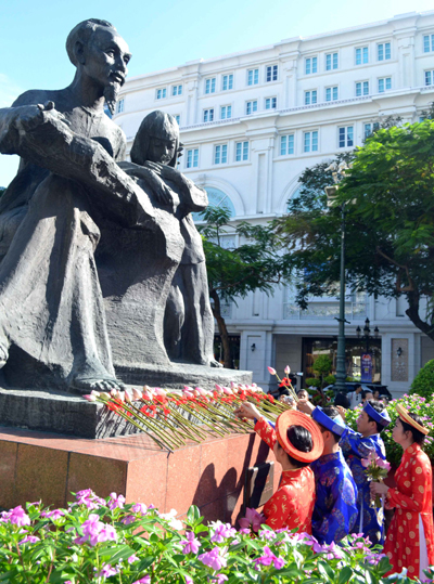 Cô dâu, chú rể dâng hoa tại tượng đài Bác Hồ.