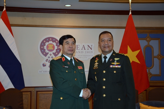 Thượng tướng Phan Văn Giang và Đại tướng Ponpipaat Benyasri, Tư lệnh Lực lượng Quốc phòng Quân đội Hoàng gia Thái Lan. |
