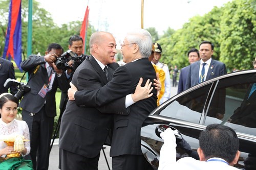 Quốc vương Nô-rô-đôm Xi-ha-mô-ni và Tổng Bí thư Nguyễn Phú Trọng tại Hoàng Cung. Ảnh: qdnd.vn.