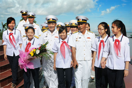 | Các cựu chiến binh của những con tàu không số giao lưu cùng các cháu học sinh tại Bến K15 (Đồ Sơn, Hải Phòng). Ảnh: Minh Trường. |