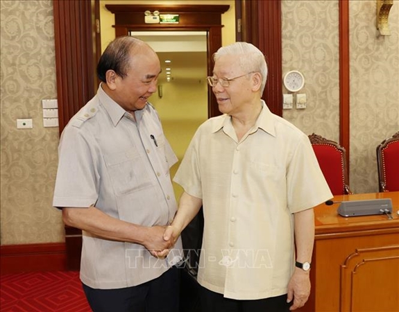 | Tổng Bí thư Nguyễn Phú Trọng và Chủ tịch nước Nguyễn Xuân Phúc dự cuộc họp. Ảnh: TTXVN. |