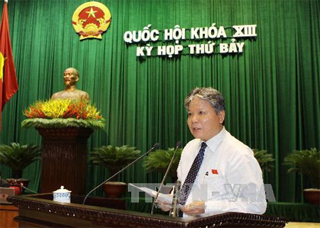 Chiều 4-6, Bộ trưởng Bộ tư pháp Hà Hùng Cường, thừa ủy quyền của Thủ tướng Chính phủ, trình bày Tờ trình về dự án Luật sửa đổi, bổ sung một số điều của Luật quốc tịch Việt Nam. Ảnh: TTXVN.
