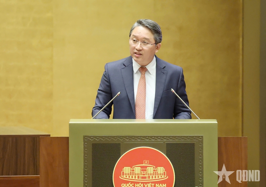 Bộ trưởng Bộ Tư pháp Nguyễn Hải Ninh giải trình trước Quốc hội, sáng 11-11. Ảnh: TRỌNG HẢI