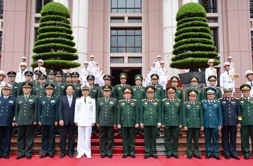 Đại tướng Ngô Xuân Lịch và Thượng tướng Phạm Trường Long duyệt đội danh dự Quân đội nhân dân Việt Nam tại Lễ đón.