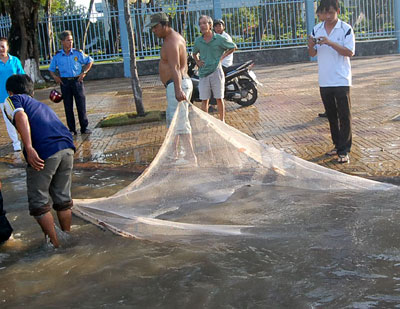 Do đường ngập nước, nhiều người dân đem lưới, vợt… tranh thủ “khai thác” cá trên… đường.