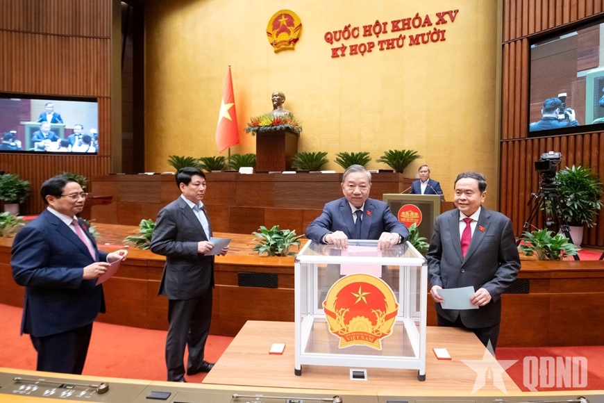 | Tổng Bí thư Tô Lâm và các đồng chí lãnh đạo Đảng, Nhà nước bỏ phiếu bầu Chánh án Tòa án nhân dân Tối cao nhiệm kỳ 2021-2026. Ảnh: PHẠM THẮNG |