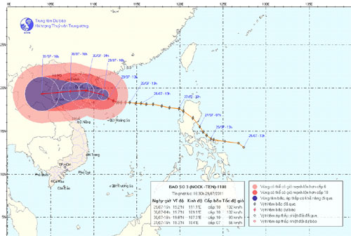 QĐND - Theo Trung tâm Dự báo Khí tượng Thủy văn Trung ương, vào chiều tối qua (29-7), vị trí tâm bão số 3 cách bờ biển Thái Bình - Hà Tĩnh khoảng 580km về phía Đông Đông Nam. Đến 16 giờ chiều 30-7, vị trí tâm bão ở vào khoảng 19,6 độ Vĩ Bắc; 107,3 độ Kinh Đông, cách bờ biển Thái Bình - Hà Tĩnh khoảng 170km về phía Đông. Sức gió mạnh nhất vùng gần tâm bão mạnh cấp 10, cấp 11 (tức là từ 89 đến 117km một giờ), giật cấp 12, cấp 13.