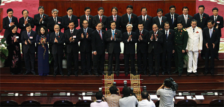 | Các thành viên chính phủ khóa mới chụp ảnh cùng Tổng Bí thư, Chủ tịch nước và Chủ tịch Quốc hội. Ảnh: DNV.vn |
