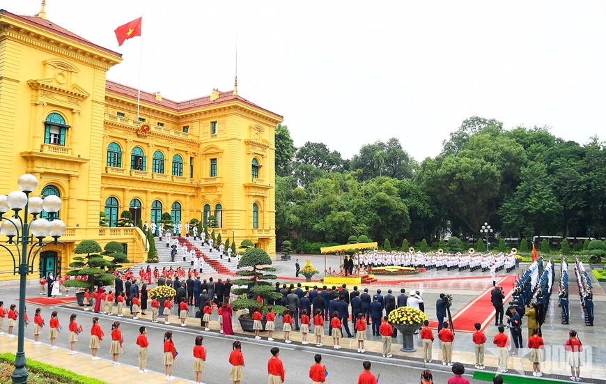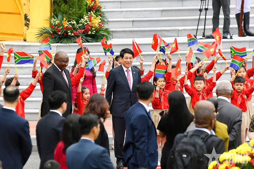Đoàn xe hộ tống đưa Tổng thống Matamela Cyril Ramaphosa tiến vào Phủ Chủ tịch, Chủ tịch nước Lương Cường có mặt tại thảm đỏ nồng nhiệt chào đón Tổng thống Matamela Cyril Ramaphosa dẫn đầu Đoàn cấp cao Nam Phi thăm cấp nhà nước đến Việt Nam. Đại diện các cháu thiếu nhi Thủ đô trao tặng Tổng thống Nam Phi bó hoa tươi thắm.
