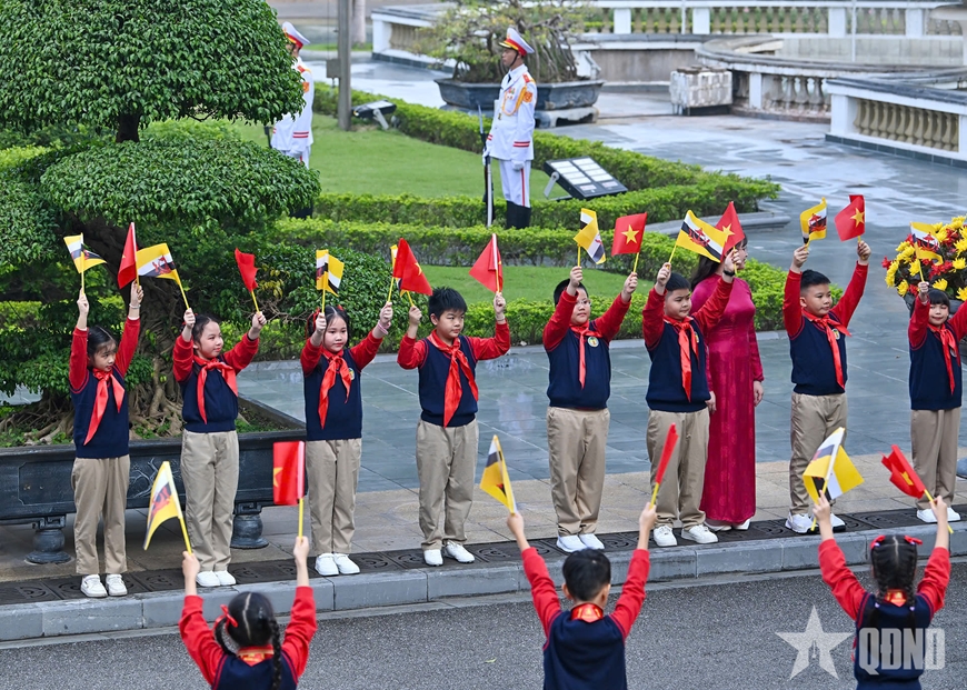Đông đảo các cháu thiếu nhi Thủ đô có mặt tại Phủ Chủ tịch vẫy cờ hai nước chào đón Quốc vương Haji Hassanal Bolkiah cùng đoàn cấp cao Brunei.
