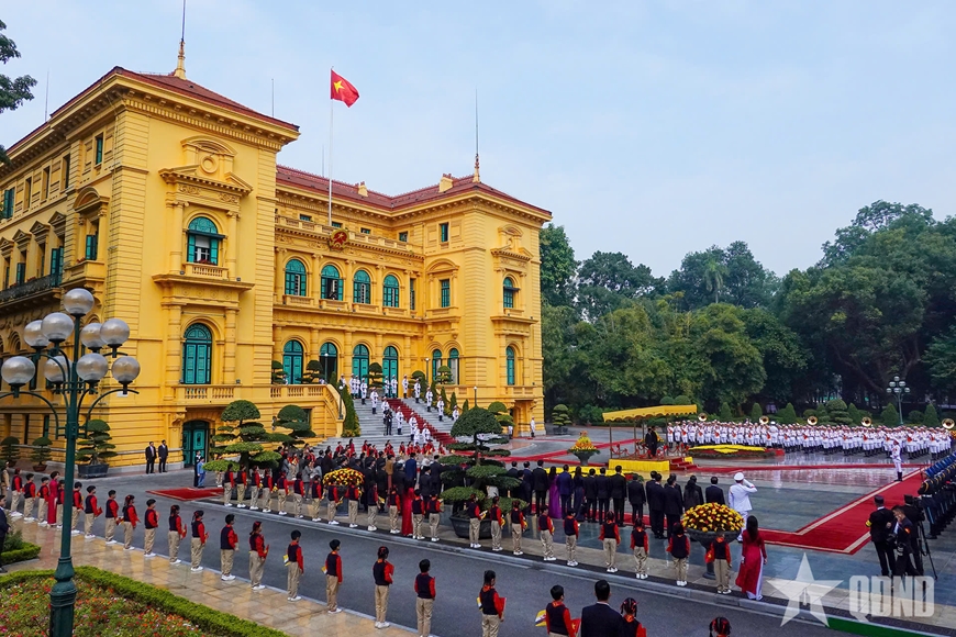 | Chủ tịch nước Lương Cường và Quốc vương Brunei Darussalam Haji Hassanal Bolkiah duyệt đội Danh dự Quân đội nhân dân Việt Nam. |