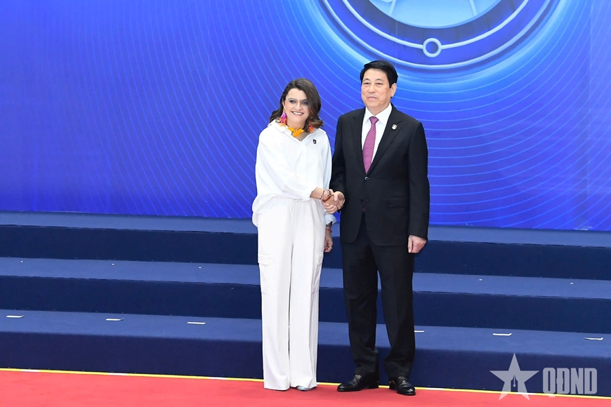 | Chủ tịch nước Lương Cường đón trưởng đoàn các nước: Ba Lan, Nga, Campuchia, Ecuador, Uzbekistan tại Lễ mở ký Công ước Hà Nội. |