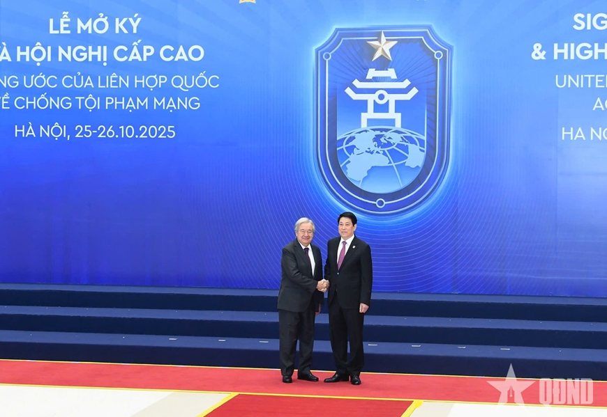 Chủ tịch nước Lương Cường và Tổng thư ký Liên hợp quốc António Guterres tại Lễ mở ký Công ước Hà Nội.
