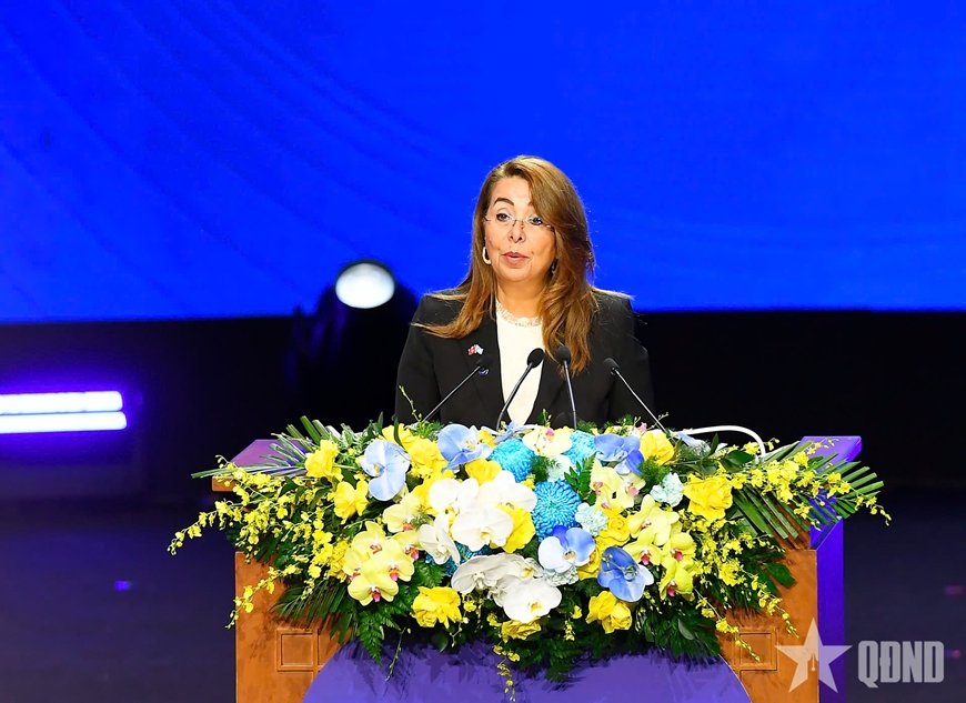 | Bà Ghada Waly, Giám đốc điều hành Văn phòng Liên hợp quốc về ma túy và tội phạm (UNODC) phát biểu tại khai mạc Lễ mở ký Công ước Hà Nội. |