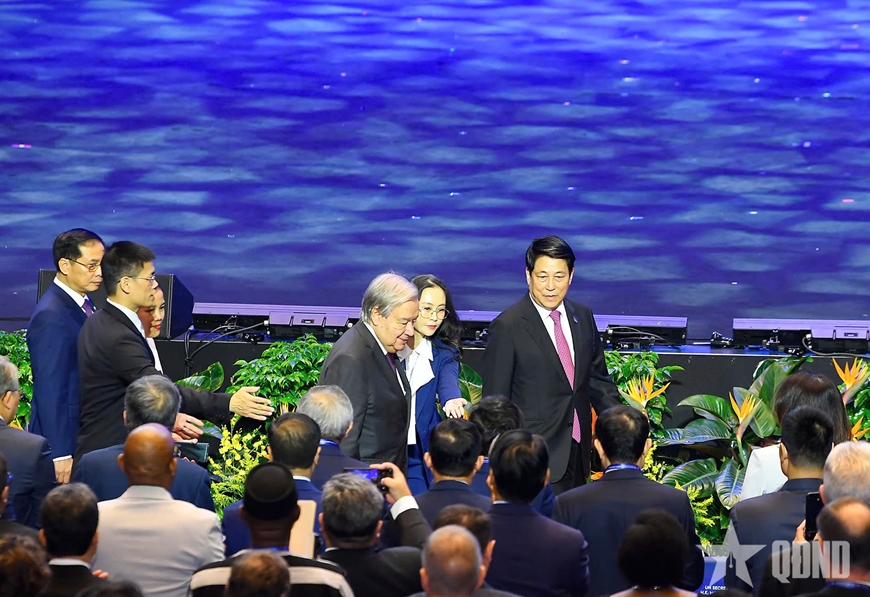 | Chủ tịch nước Lương Cường và Tổng thư ký Liên hợp quốc António Guterres tại khai mạc. |