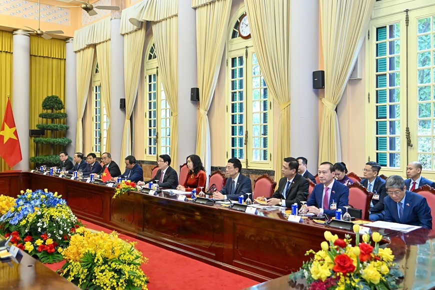 Chủ tịch nước Lương Cường và đoàn cấp cao Việt Nam tham dự hội đàm.