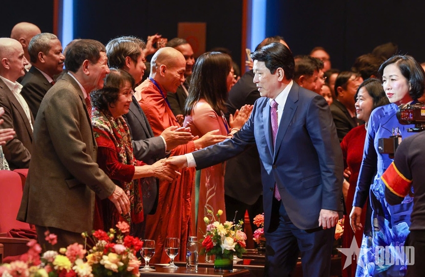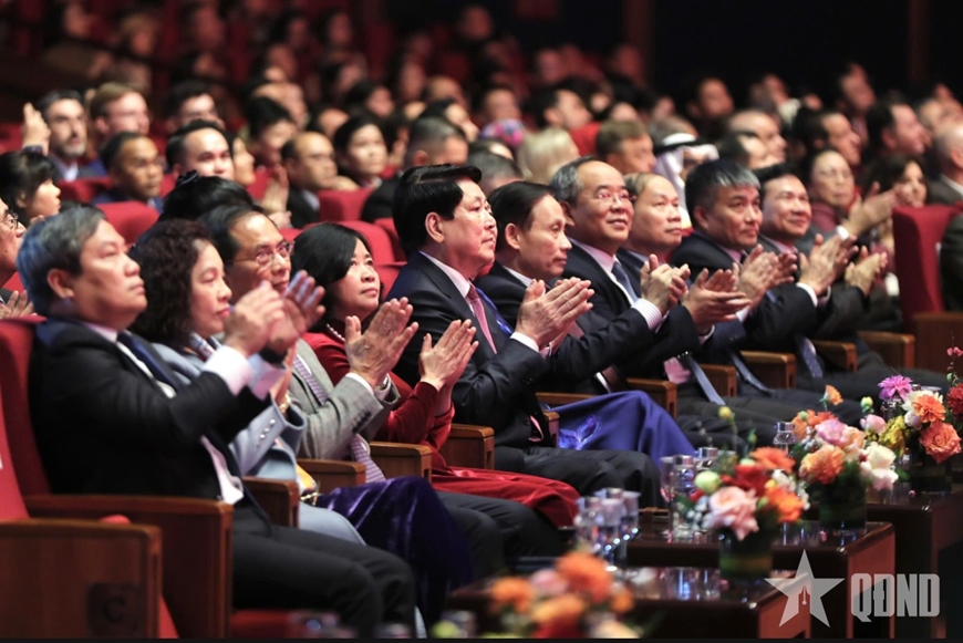 Chủ tịch nước và Phu nhân cùng bà con kiều bào đã lắng nghe chương trình nghệ thuật đặc biệt "Xuân Quê hương 2026". Chương trình gồm 3 chương: Chương I: Những cánh én trở về; chương II: Hà Nội – Niềm tin và hy vọng; Chương III: Khát vọng Việt Nam: Hòa bình, thịnh vượng.