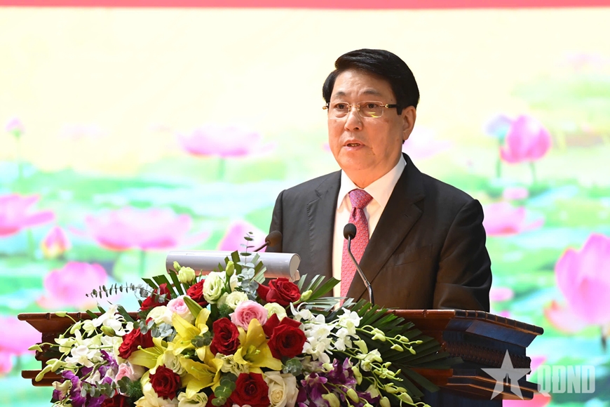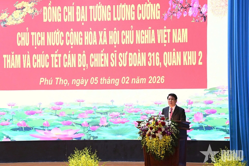 | Chủ tịch nước Lương Cường phát biểu động viên cán bộ, chiến sĩ Sư đoàn 316. |