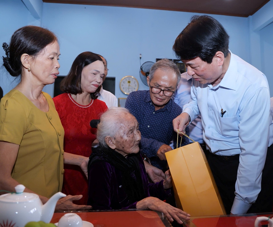 | Chủ tịch nước Lương Cường thăm Bà mẹ Việt Nam anh hùng Nguyễn Thị Ngôn (thôn Bảo An, xã Gò Nổi). |