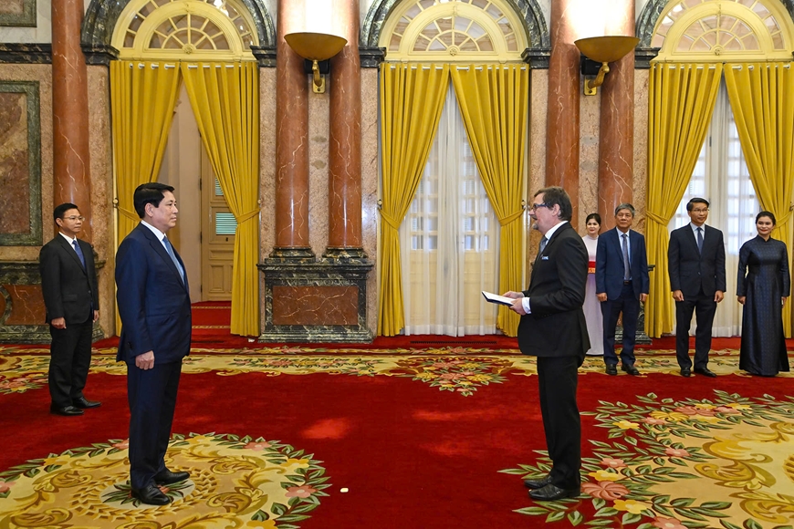 Chủ tịch nước Lương Cường nhận Quốc thư từ Đại sứ Phần Lan Pekka Voutilainen trình.