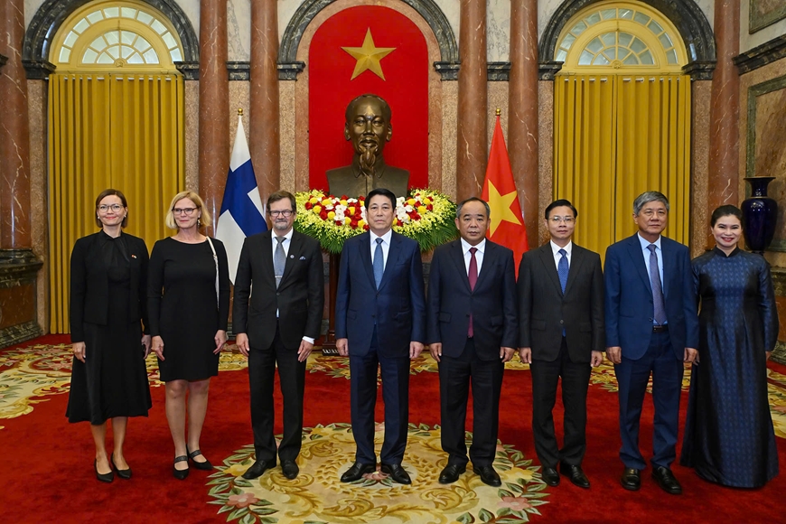 Chủ tịch nước Lương Cường và Đại sứ Phần Lan Pekka Voutilainen cùng các đại biểu.
