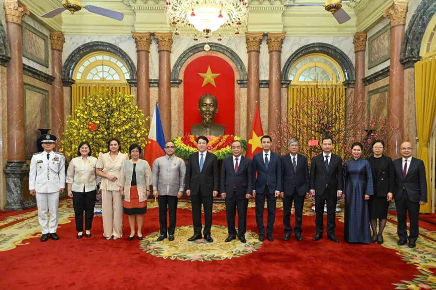 Chủ tịch nước Lương Cường và Đại sứ Philippines Francisco Noel R. Fernandez III cùng các đại biểu tại buổi tiếp.