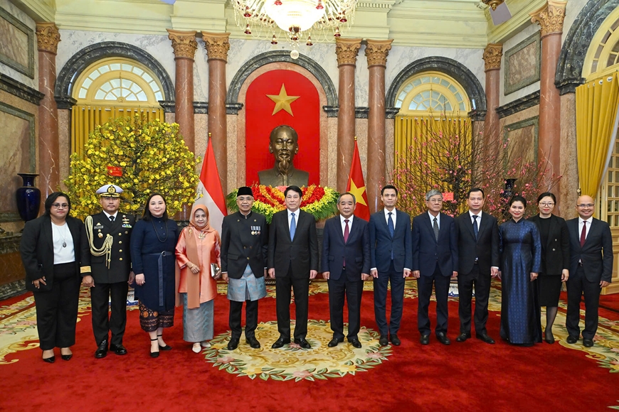 Chủ tịch nước Lương Cường và Đại sứ Indonesia Adam Mulawarman Tugio cùng các đại biểu tại buổi tiếp.