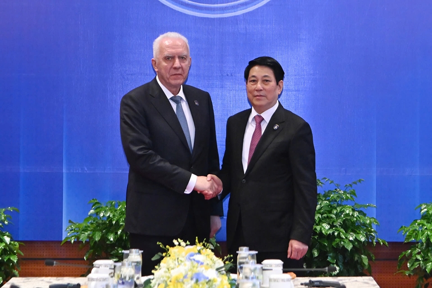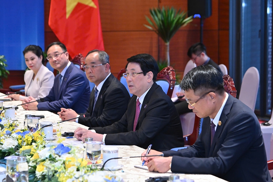 | Chủ tịch nước Lương Cường và các đại biểu đoàn Việt Nam tại buổi tiếp. |