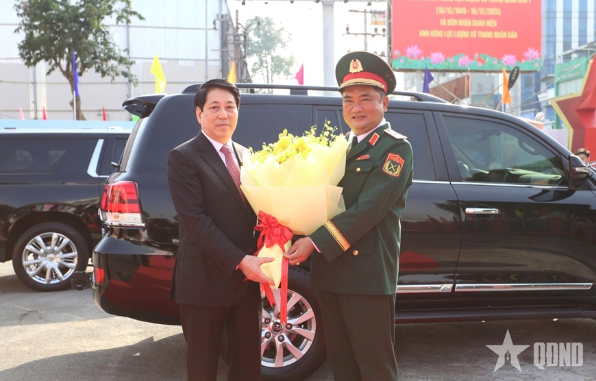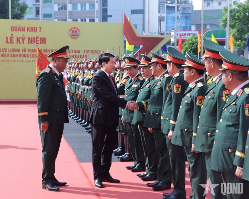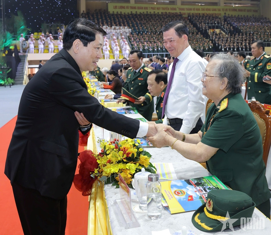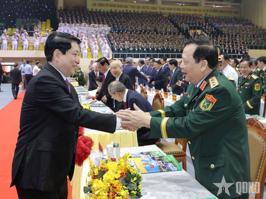 | Chủ tịch nước Lương Cường và Đại tướng Phan Văn Giang, Đại tướng Nguyễn Trọng Nghĩa cùng các đại biểu và lãnh đạo chủ chốt Bộ tư lệnh Quân khu 7 |