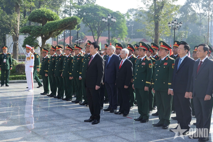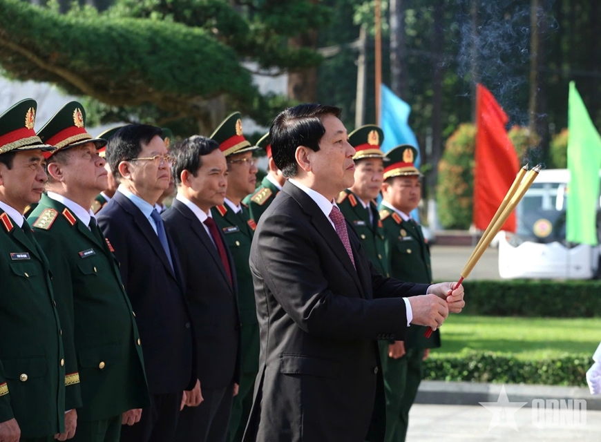 | Chủ tịch nước Lương Cường và các đại biểu dâng hương tại Đài tưởng niệm Chủ tịch Hồ Chí Minh trong khuôn viên Quân khu 7. |