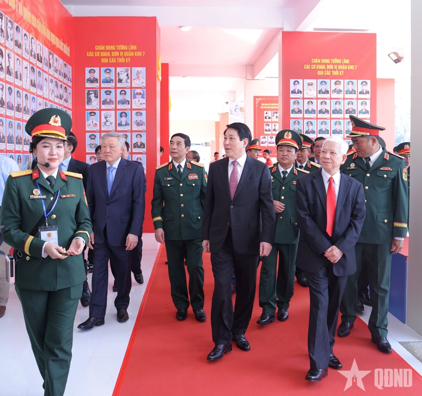| Chủ tịch nước Lương Cường và các đại biểu thăm quan khu trưng bày truyền thống Quân khu 7. |