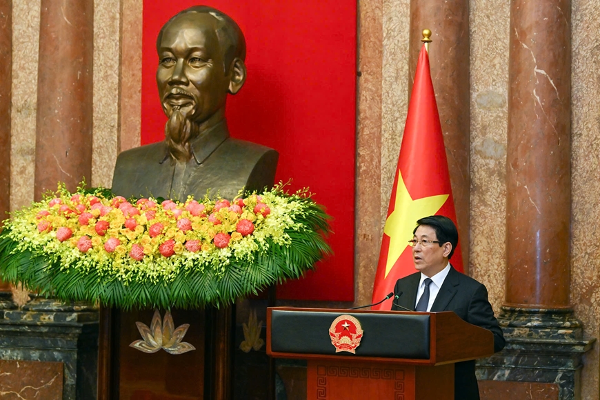 Chủ tịch nước Lương Cường phát biểu giao nhiệm vụ cho các Đại sứ. |