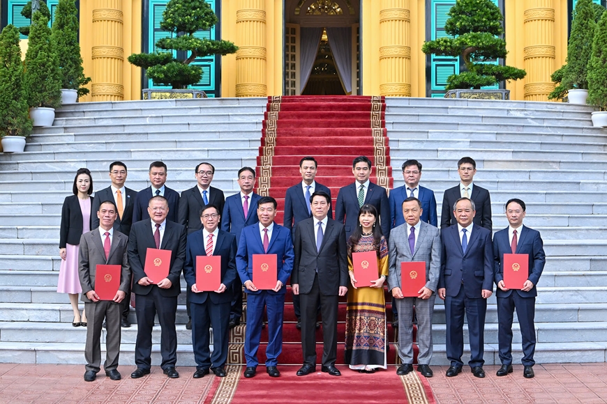 Chủ tịch nước Lương Cường và các đại biểu với các Đại sứ được phong hàm và bổ nhiệm mới.