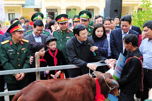Chủ tịch nước Trương Tấn Sang đích thân trao bò tặng đồng bào nghèo tại xã Thanh Thủy, huyện Vị Xuyên, tỉnh Hà Giang.