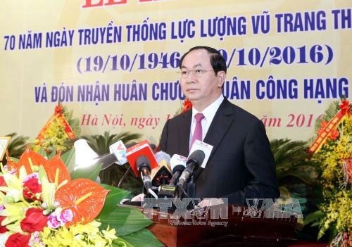 Phát biểu tại Lễ kỷ niệm, Chủ tịch nước Trần Đại Quang nhiệt liệt biểu dương nỗ lực phấn đấu, những chiến công, thành tích đặc biệt xuất sắc mà lực lượng vũ trang Thủ đô đã giành được trong suốt chặng đường 70 năm qua. Chủ tịch nước bày tỏ lòng biết ơn và tri ân sâu sắc các Anh hùng liệt sĩ, Mẹ Việt Nam Anh hùng, Anh hùng lực lượng vũ trang nhân dân, thương binh, bệnh binh, gia đình liệt sĩ và các tướng lĩnh, sĩ quan, cán bộ, quân nhân chuyên nghiệp, công nhân, viên chức quốc phòng, chiến sĩ lực lượng vũ trang nhân dân nói chung, lực lượng vũ trang Thủ đô nói riêng đã suốt đời cống hiến, hy sinh cho mục tiêu lý tưởng của Đảng, hạnh phúc của nhân dân.