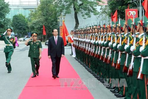 Chủ tịch nước Trần Đại Quang đến dự Lễ kỷ niệm 70 năm Ngày truyền thống Lực lượng vũ trang Thủ đô Hà Nội. Ảnh: TTXVN