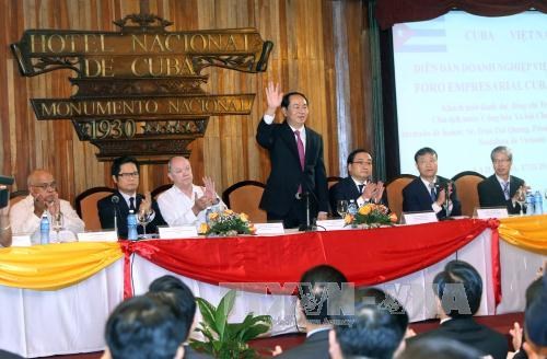 Chủ tịch nước Trần Đại Quang nhấn mạnh Đảng, Nhà nước và nhân dân hai nước luôn kỳ vọng và mong muốn các doanh nghiệp Việt Nam, Cu-ba tiếp tục phát huy tinh thần chủ động và sáng tạo, nhạy bén nắm bắt thời cơ, vận hội mới nhằm khai thác hiệu quả những tiềm năng hợp tác kinh tế - thương mại và đầu tư to lớn giữa hai nước; đồng thời, hỗ trợ lẫn nhau tiếp cận, thâm nhập vào thị trường hai khu vực Đông Nam Á và Mỹ Latinh - Caribe...