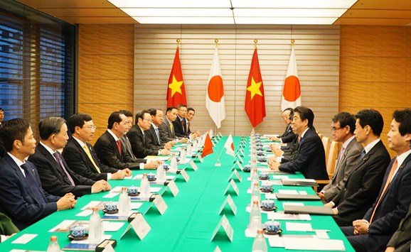 Tại buổi hội đàm, trong bầu không khí hữu nghị, tin cậy và hiểu biết lẫn nhau, hai nhà lãnh đạo đã trao đổi ý kiến sâu rộng về quan hệ Việt Nam-Nhật Bản và bày tỏ vui mừng về việc quan hệ hai nước đang ở giai đoạn rất tốt đẹp qua 45 năm kể từ khi thiết lập quan hệ ngoại giao, phát triển thực chất, nhanh chóng trên mọi lĩnh vực với nhiều điểm tương đồng về lợi ích chiến lược. Hai nhà lãnh đạo đã nhất trí cao về những phương hướng lớn và các biện pháp cụ thể để đưa quan hệ đối tác chiến lược sâu rộng Việt Nam-Nhật Bản phát triển toàn diện, thực chất và hiệu quả hơn nữa trong thời gian tới; nhất trí năm 2018 là năm khởi đầu mở ra một giai đoạn phát triển mới trong quan hệ hai nước.