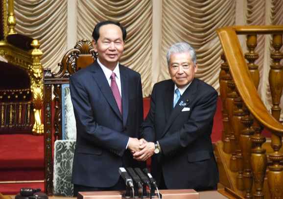 Chủ tịch nước Trần Đại Quang bày tỏ vui mừng trước sự phát triển nhanh, thực chất và toàn diện của quan hệ Việt Nam – Nhật Bản trong 45 năm qua, đặc biệt là kể từ khi hai nước nâng cấp quan hệ thành Đối tác chiến lược sâu rộng năm 2014; đánh giá cao và cảm ơn Thượng viện cũng như cá nhân Ngài Chủ tịch Chuichi Date đã tích cực thúc đẩy quan hệ hợp tác giữa hai nước trên nhiều lĩnh vực kinh tế, đầu tư, giao lưu nhân dân; khẳng định Việt Nam luôn coi Nhật Bản là đối tác quan trọng hàng đầu và lâu dài của Việt Nam.