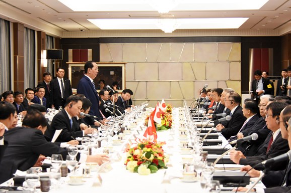 Phát biểu tại cuộc gặp gỡ, Chủ tịch nước cho biết chuyến thăm chính thức cấp Nhà nước tới Nhật Bản lần này diễn ra đúng vào dịp hai nước đang thiết thực kỷ niệm 45 năm Ngày thiết lập quan hệ ngoại giao; các hoạt động tiếp xúc, gặp gỡ lãnh đạo các tập đoàn hàng đầu của Nhật Bản, là thành viên của Keidanren để cùng trao đổi về những giải pháp, chia sẻ những ý tưởng xây dựng không gian hợp tác kinh tế mới giữa hai nước hiệu quả hơn nữa là những hoạt động thiết thực nhằm thắt chặt quan hệ kinh tế, thúc đẩy giao lưu kết nối doanh nghiệp hai nước, góp phần thúc đẩy quan hệ hợp tác kinh tế Việt Nam - Nhật Bản có bước phát triển mới.