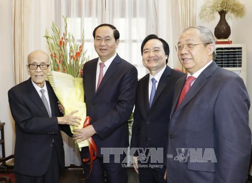 Sáng cùng ngày, Chủ tịch nước Trần Đại Quang đến thăm và chúc Tết Giáo sư, Nhà giáo nhân dân Hà Minh Đức.