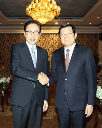 Chủ tịch nước Trương Tấn Sang tiếp cựu Tổng thống Hàn Quốc Li Miêng Pắc. Ảnh: TTXVN