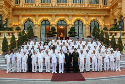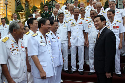 QĐND Online – Chiều 20-10, tại Phủ Chủ tịch, Chủ tịch nước Trương Tấn Sang đã tiếp Đoàn đại biểu Đoàn tàu không số toàn quốc. Cùng dự buổi tiếp có Phó Đô đốc Nguyễn Văn Hiến, Thứ trưởng Bộ Quốc phòng, Tư lệnh Quân chủng Hải quân và Trung tướng Lương Cường, Phó Chủ nhiệm Tổng cục Chính trị.
