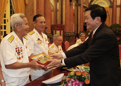 | Chủ tịch nước Trương Tấn Sang tặng quà lưu niệm cho các cựu chiến binh Đoàn tàu không số. |