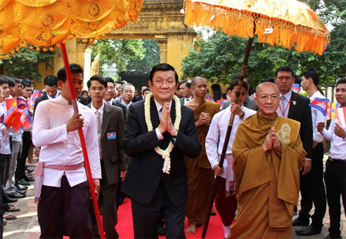 QĐND Online - Trong khuôn khổ chuyến thăm cấp Nhà nước Vương quốc Campuchia, sáng 24-12, Chủ tịch nước Trương Tấn Sang đã đến thăm Đại Tăng Thống Tep Vong ở chùa Unnalom và Đại Tăng Thống Bour Kry ở chùa Svay Pope. Cùng đi với Chủ tịch nước, ngoài đoàn đại biểu cấp cao Việt Nam còn có 3 vị cao tăng Việt Nam là Hòa thượng Thích Thiện Nhơn, Quyền chủ tịch Hội đồng trị sự; Hòa thượng Thích Thiện Tâm, Phó chủ tịch Hội đồng trị sự Trung ương Giáo hội Phật giáo Việt Nam và Thượng tọa Danh Lung.