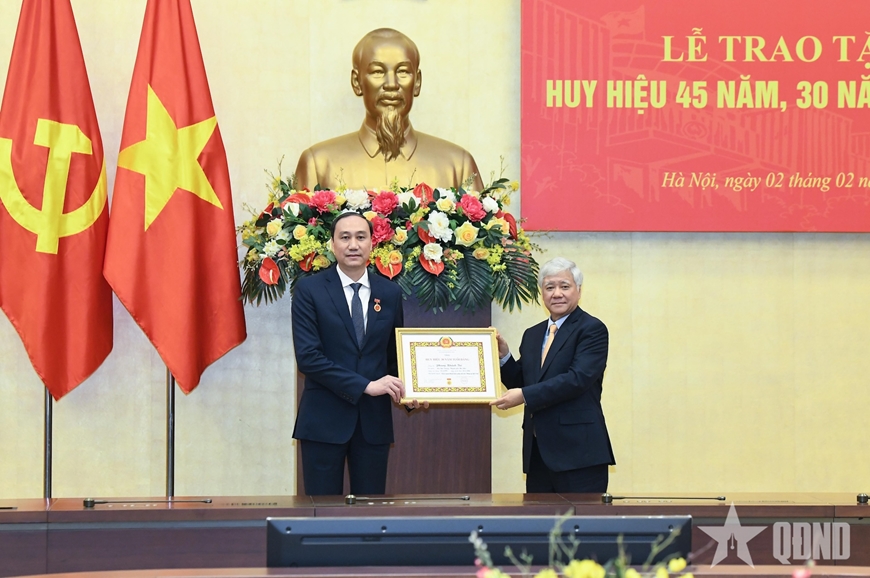 | Phó chủ tịch Thường trực Quốc hội Đỗ Văn Chiến trao Huy hiệu 30 năm tuổi Đảng tặng Phó bí thư Đảng ủy Quốc hội Phùng Khánh Tài. |