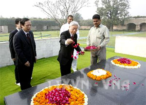 | Chủ tịch Quốc hội Nguyễn Phú Trọng rắc hoa tại Đài tưởng niệm Mahatma Gandhi. Ảnh: Trí Dũng - TTXVN |